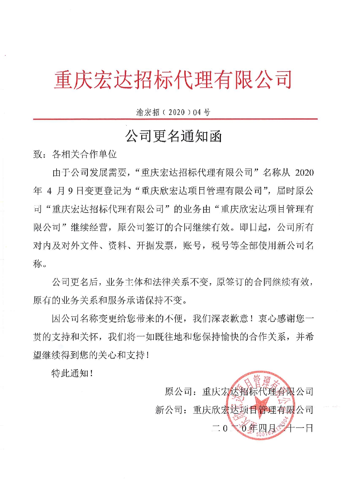 由于公司發(fā)展需要,“重慶宏達(dá)招標(biāo)代理有限公司”名稱從 2020 年 4 月9日變更登記為“重慶欣宏達(dá)項目管理有限公司”,屆時原公司“重慶宏達(dá)招標(biāo)代理有限公司”的業(yè)務(wù)由“重慶欣宏達(dá)項目管理有限公司”繼續(xù)經(jīng)營,原公司簽訂的合同繼續(xù)有效。即日起,公司所有對內(nèi)及對外文件、資料、開據(jù)發(fā)票,賬號,稅號等全部使用新公司名稱。 公司更名后,業(yè)務(wù)主體和法律關(guān)系不變,原簽訂的合同繼續(xù)有效,原有的業(yè)務(wù)關(guān)系和服務(wù)承諾保持不變。 因公司名稱變更給您帶來的不便,我們深表歉意!衷心感謝您一貫的支持和關(guān)懷,我們將一如既往地和您保持愉快的合作關(guān)系,并希望繼續(xù)得到您的關(guān)心和支持! 特此通知!